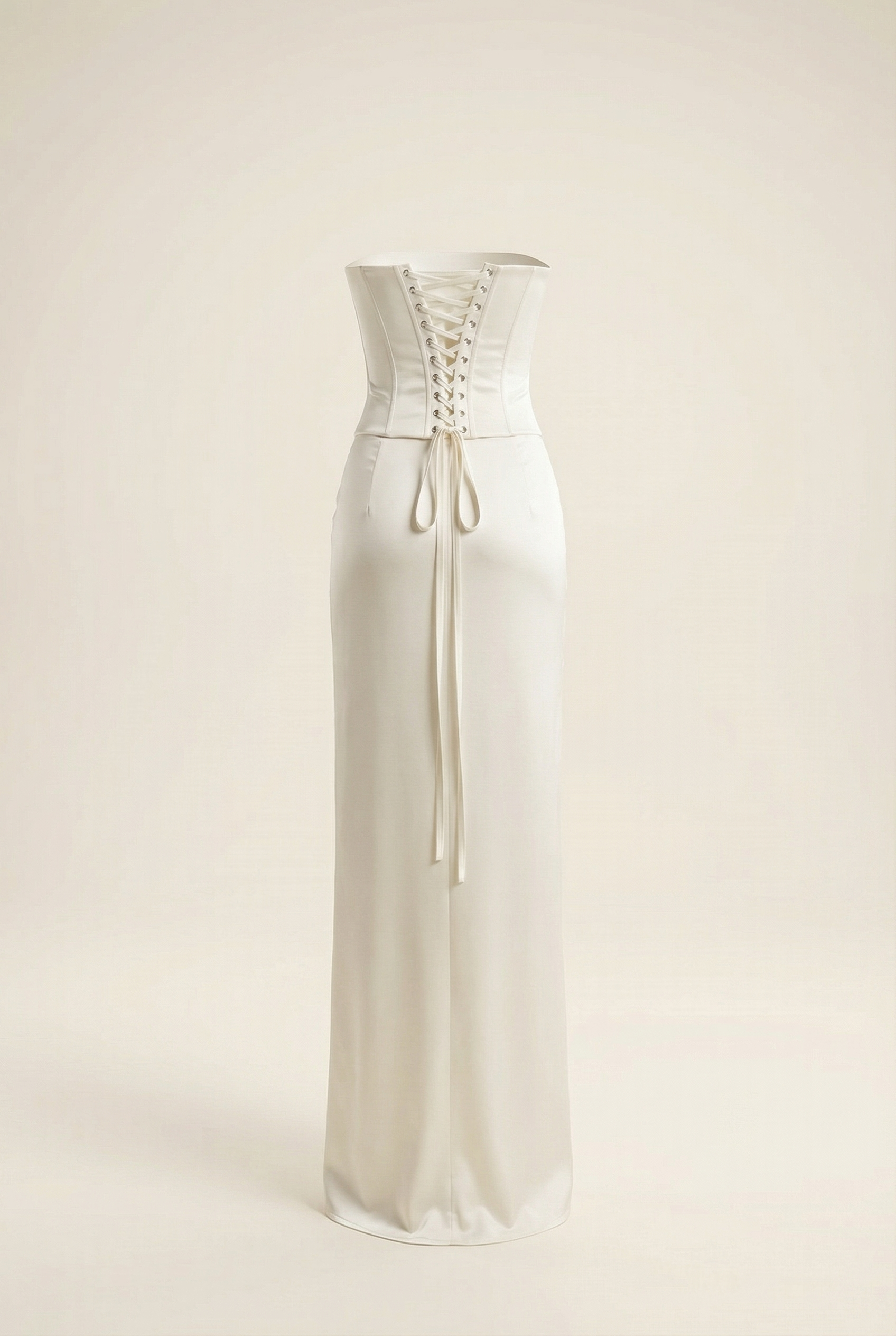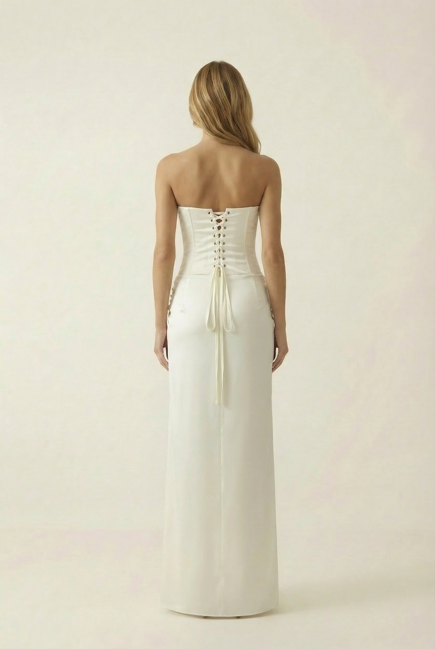 Une plage de sable blanc, un souffle chaud, une silhouette qui s’avance avec grâce. La robe Calista épouse le corps comme une seconde peau, dessinant une taille sculptée par un corset intégré. Son bustier droit, rehaussé d’un délicat galon de dentelle, capte la lumière avec subtilité. Le satin glisse le long des hanches avant de s’ouvrir en une fente vertigineuse, laissant deviner le mouvement à chaque pas. Son drapé noué sur le côté ajoute une touche de nonchalance maîtrisée, entre sensualité et élégance balnéaire.