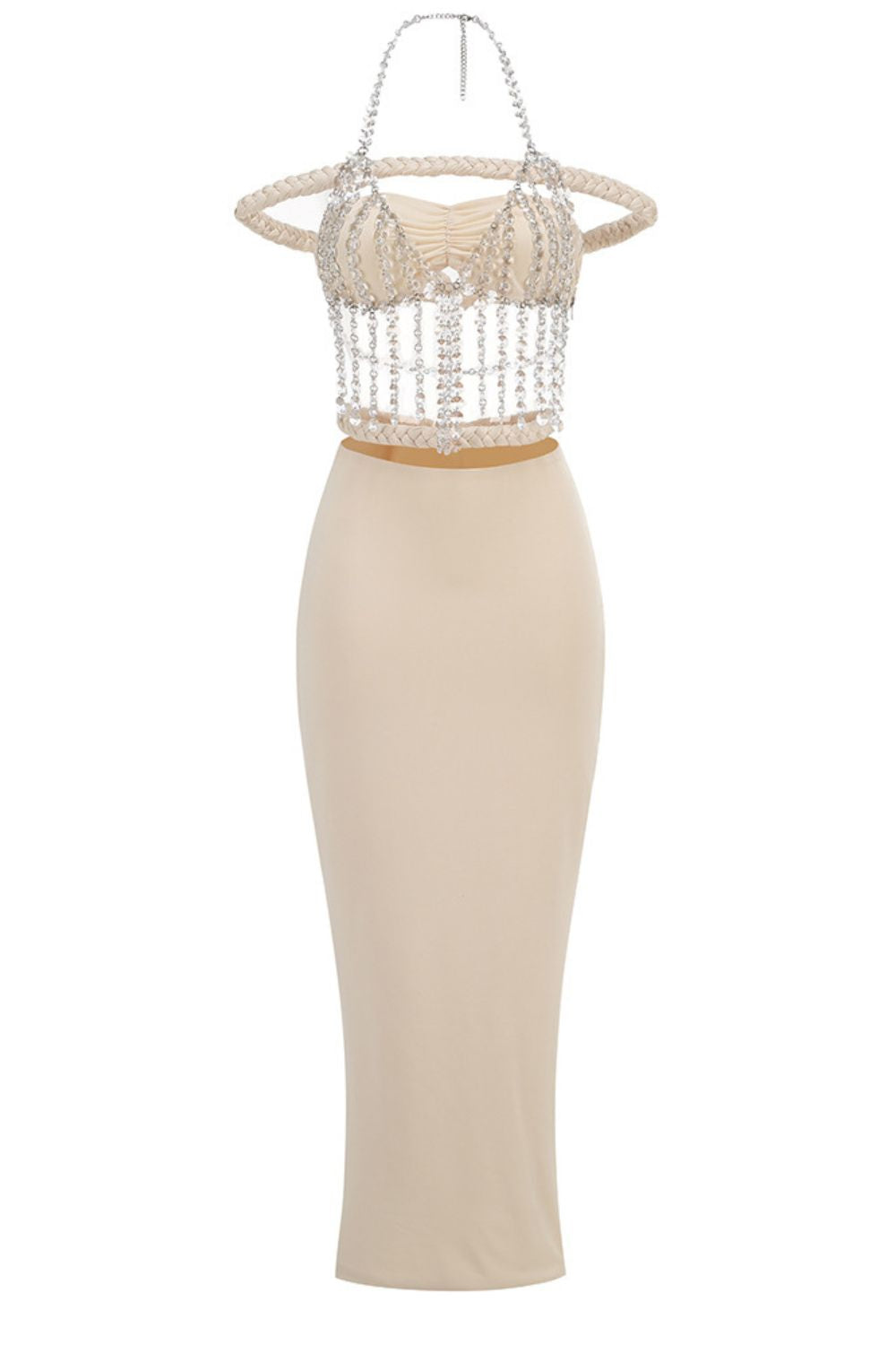 Radiant and sculptural, Bianca blends sensuality and refinement. Its mermaid cut accentuates the curves, while the dangling beaded crystals enhance the bust. The off-the-shoulder design and crossover back reveal a jewel-like look that's luminous and bold.