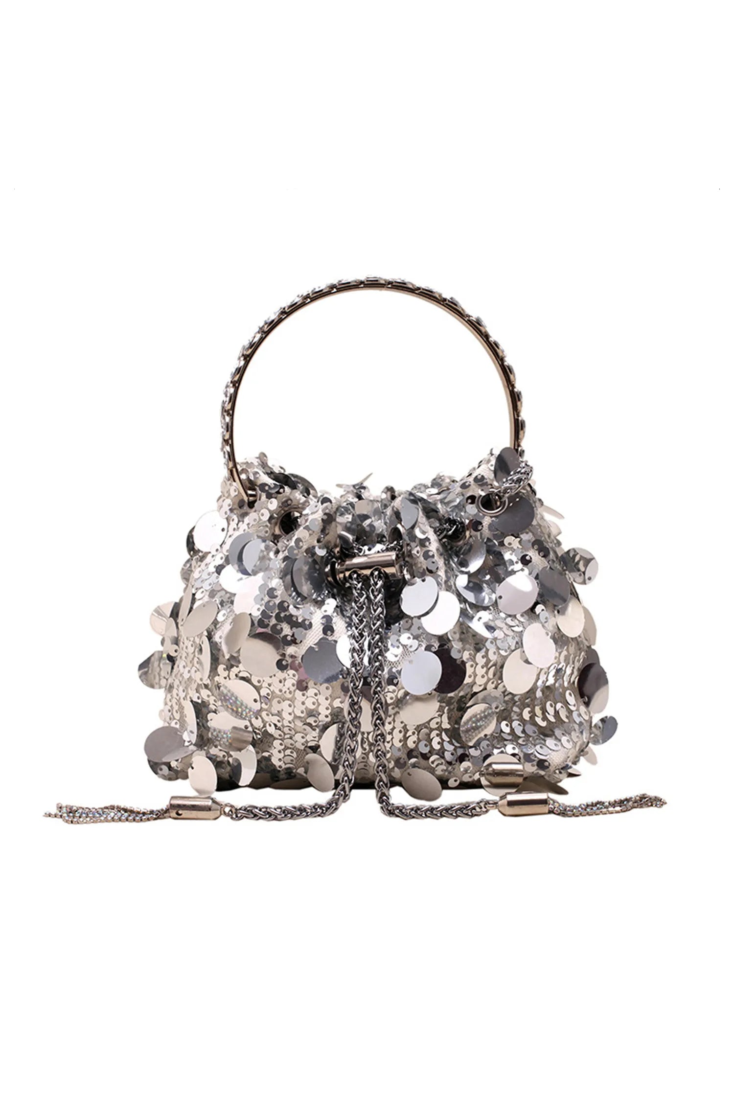 Este pequeño bolso plateado con lentejuelas brillantes es un concentrado de elegancia festiva. Su asa de perla y su acabado metálico lo convierten en el aliado perfecto para tus salidas nocturnas. Guarda tus imprescindibles: teléfono, llaves, pintalabios. Glamour garantizado.
