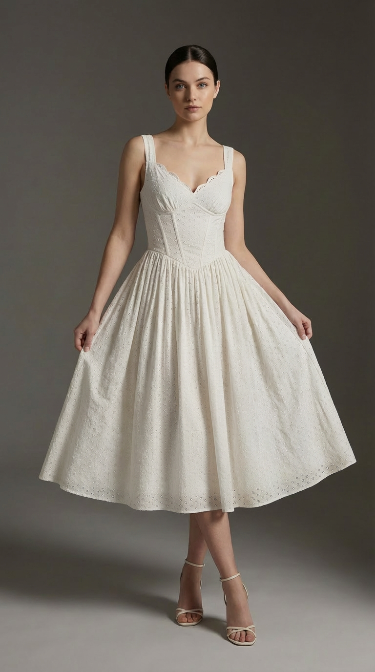 La robe Althea capture cette douceur intemporelle avec une grâce d’un autre temps. Son bustier corseté sculpte la silhouette avec justesse, tandis que l’échancrure en cœur rehaussée de bordures festonnées évoque un charme délicatement rétro. La jupe s’épanouit en corolle généreuse, brodée d’œillets subtils, dans un volume léger et aérien.